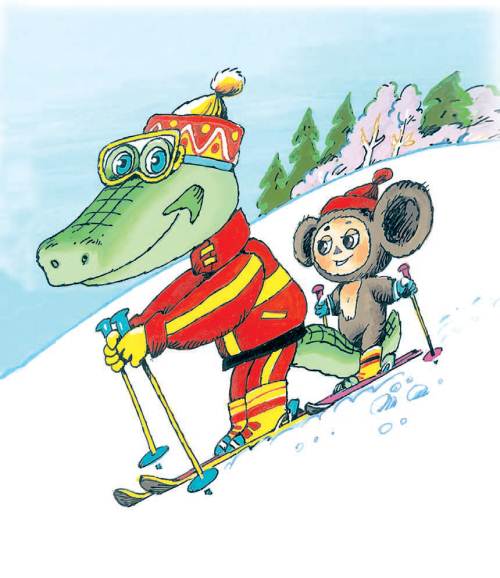 И правда – он всё здорово придумал! Чебурашка со своими лыжами садился Гене на хвост, и теперь они весело неслись вниз вдвоём. Даже с самой крутой горы. И Чебурашке уже не надо было сушиться.