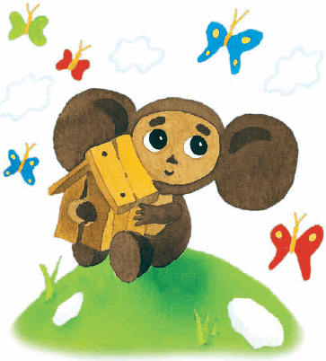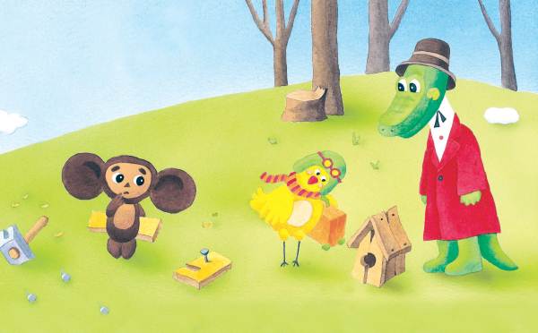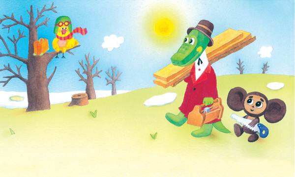 Приближалась весна. Одна птичка уже прилетела. Гена и Чебурашка решили сделать скворечники. Они достали пилу, доски, гвозди и принялись за дело.