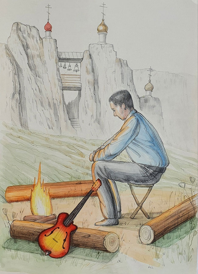 Подниматься было сложно, ступеней всего было пятьсот пятьдесят, и они серпантином проходили между больших валунов, зарослей можжевельника и лохматых елей. На полпути находилась небольшая смотровая площадка, на которой можно было немного передохнуть. Когда Паша добрался до этого места, у него не было сил даже обернуться и посмотреть, какая красота расстилается за его спиной. Рюкзак значительно потяжелел после того, как были распределены между всеми провизия и оборудование, а у него еще был довесок, ценный и при этом неудобный груз – гитара. Но зато, когда все поднялись наверх, перед их взором возникла сказочная красота. Чуть поодаль, у подножья мелового холма возвышался вход в пещерный храм. Он представлял из себя две пирамиды разной величины, сделанные руками матери-природы. На вершины пирамидок были водружены небольшие золоченые главки с крестами, а между ними свешивался ажурный подвесной мост с крышей, на котором была устроена колокольня. Фронтальные части входа были украшены мозаичными иконами Святого Георгия. Неподалеку от храма вырисовывался одноэтажный деревянный барак, он и был местом пристанища собравшихся путешественников. Внутри все выглядело предельно аскетично: кровати, застеленные плотными серыми простынями, поверх которых у каждого лежало скрученное шерстяное одеяло и небольшая подушка, набитая морской тиной, у окна стоял деревянный стол, на котором было несколько фаянсовых глубоких тарелок и горка перевернутых кружек, прикрытых полосатым льняным полотенцем. И везде царила идеальная чистота.
