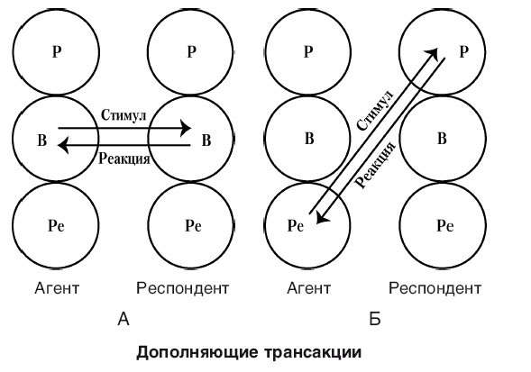 Обе эти трансакции являются дополняющими, то есть реакция на стимул правильная, ожидаемая и вытекает из нормальных человеческих взаимоотношений. Первая трансакция (которая классифицируется как дополняющая трансакция типа 1) представлена на рис. 2А. Вторая (дополняющая трансакция типа 2) – показана на рис. 2Б. Очевидно, однако, что трансакции связываются в цепочки таким образом, что каждая реакция, в свою очередь, становится стимулом. Первое правило коммуникации таково: коммуникация будет осуществляться беспрепятственно, пока трансакции остаются дополняющими; следствие этого правила: пока трансакции остаются дополняющими, коммуникация в принципе может продолжаться неограниченно долго. Это правило не зависит от природы или содержания трансакций; оно основано исключительно на направлении действий. Пока трансакции остаются дополняющими, неважно, о чем говорят двое людей: ворчат по-стариковски (Родитель – Родитель), решают проблему (Взрослый – Взрослый) или играют друг с другом (Ребенок – Ребенок или Родитель – Ребенок).