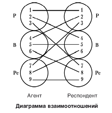 На рис. 4 представлена диаграмма взаимоотношений, на которой показаны девять возможных векторов отношений между спрашивающим и отвечающим; эта диаграмма обладает некоторыми интересными геометрическими (топологическими) свойствами. Дополняющие трансакции между «психологически равными» представлены типами (1 → 1) (1 ← 1), (5 → 5) (5 ← 5) и (9-»9) (9 ← 9). Существуют еще три других дополняющих трансакции: (2 → 4) (2 ← 4), (3 → 7) (3 ← 7) и (6 → 8) (6 ← 8). Все остальные комбинации представляют пересекающиеся трансакции, и в большинстве случаев этому соответствует пересечение векторов на диаграмме, например (3 → 7) (7 ← 3): в этом случае два человека смотрят друг на друга, лишившись дара речи. Если ни один из них не сдается, коммуникация завершена и они должны разойтись.