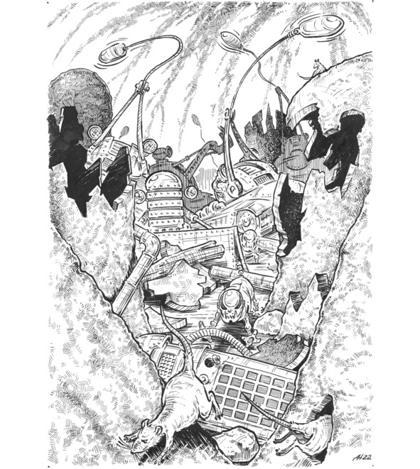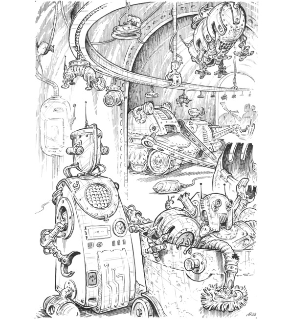 Крысы, селились в южной части. Когда-то эо жили там, но однажды ушли в Северный сектор. Мы прекрасно себя чувствовали в заброшенных домах, среди окаменевших кустов и в подземных каналах. Проблем с едой не было: в районе продолжала работу фабрика-автомат по переработке пищевых отходов. Что еще нужно для счастья? Но было в нашем районе то, что притягивало нас, будило фантазию и разжигало любопытство. Это завод по ремонту машин. Его тихое гудение сопровождало нашу жизнь с рождения. Каждый вечер перед воротами цеха зависали четырехмоторные аппараты – беспилотные коптеры. Они осторожно опускали на землю неподвижные, потерявшие способность работать машины.