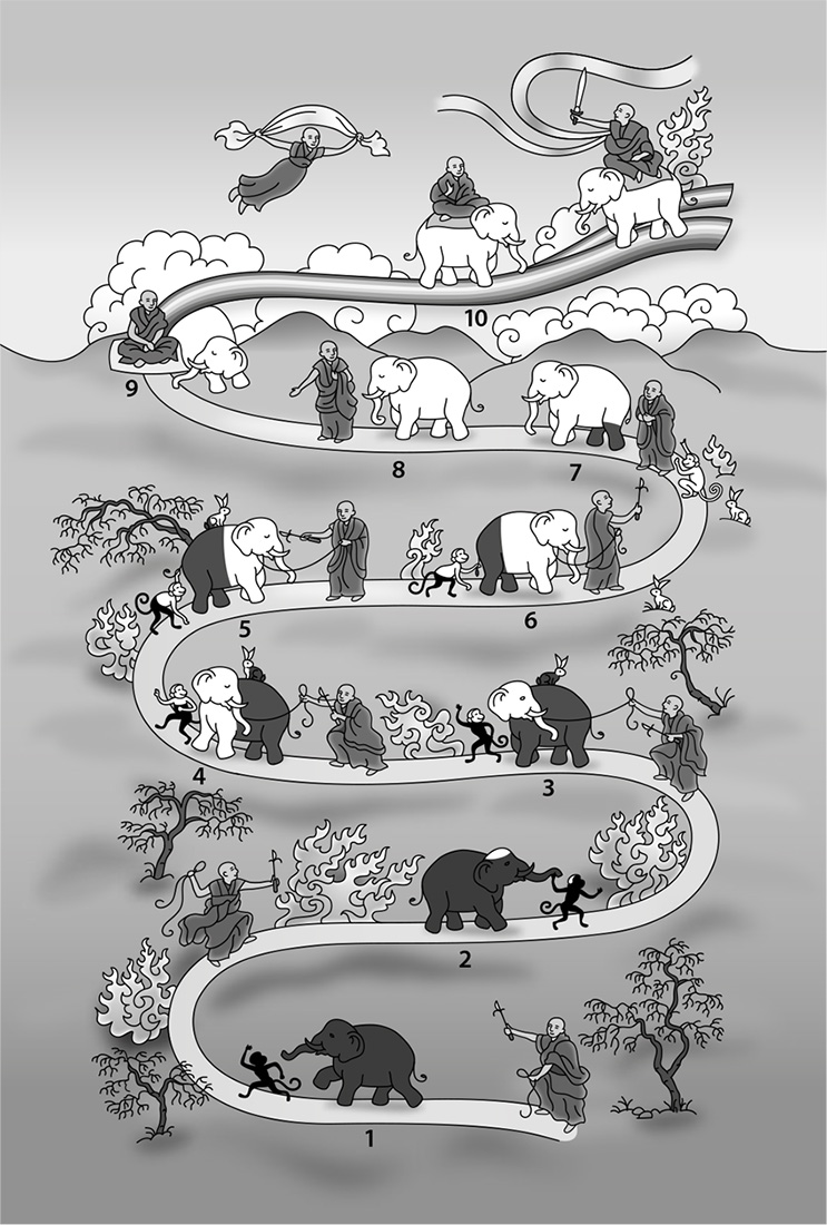 Десять ступеней медитации. Монах – это тот, кто практикует медитацию. Верёвка в его руке представляет бдительную внимательность. Стрекало в другой символизирует твердое намерение и сильную решимость. Слон – это ум. Черный цвет слона символизирует пять помех и семь порожденных ими проблем. Обезьяна показывает рассеянность внимания, а черный цвет означает тонкое и грубое отвлечение, забывчивость и блуждание ума. Кролик – это тонкий вид притупленности. Пламя – это бдительность и усилия, и когда в них больше нет нужды, оно исчезает. Длина пути между сменяющими друг друга ступенями указывает на условное время, необходимое для перехода от одной ступени к другой. Расстояние между ними уменьшается вплоть до седьмой, затем промежутки снова увеличиваются. Поскольку дорога петляет, можно перейти на более высокие ступени или вернуться к более низким.