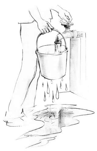 Рисунок 2. Если навыки и знания, которые мы обретаем на подушке для медитации, не пронизывают нашу повседневную жизнь, развитие будет довольно медленным. Так вы словно пытаетесь заполнить дырявое ведро.