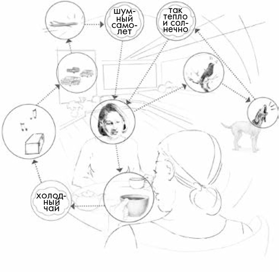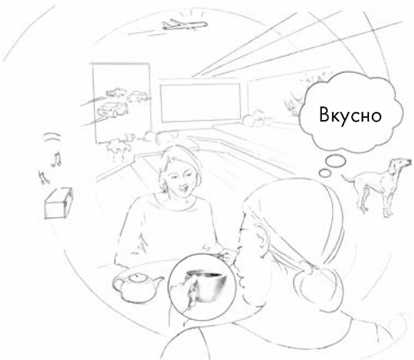 Совместная работа внимания и периферийного осознавания похожа на отношения между точкой фокуса и тем, что вы замечаете периферийным зрением. Попробуйте остановить взгляд на внешнем объекте. Вы заметите, что при этом ваше периферийное зрение воспринимает всю доступную ему информацию. Сравните это с вашим повседневным опытом, связанным с вниманием и периферийным осознаванием: первое покоится на чем-то, а второе занимается остальным. Например, слушая чью-то речь, вы осознаете вкус чая, который пьете, фоновый шум уличного движения и приятные ощущения от того, что вы сидите в уютном кресле. Как и в случае со зрением, мы более полно осознаем центральный объект нашего внимания, но сохраняем периферийное осознавание множества других объектов. При смещении центра внимания то, что прежде было главным, уходит на периферию. Когда внимание переходит с одного объекта на другой (от разговора к кружке чая), мы поочередно более полно осознаем каждый предмет, сохраняя периферийное осознавание всех остальных.