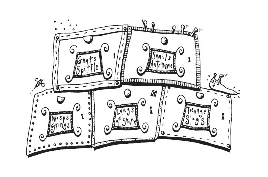 Jessica glanced behind Miss Strega at the wall of drawers with their spidery handwritten labels. For a moment in the bad light, the letters seemed to be all mixed up. “Gnats’ Spittle, Bats’ Legs,” she read, “Frogspawn.”