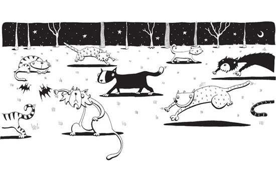 It was getting dark as Jessica walked home. A tiny Batman and a white-sheeted ghost hurried past clutching their bags of Halloween goodies. Large pumpkin lanterns with jagged mocking teeth grinned at her from windowsills. There seemed to be an amazing number of cats out and about. Big fluffy marmalades, sleek Siamese, silver tabbies and black moggies did figures-of-eight around her legs. They sniffed at her broom and mewed loudly. “Miaou, miaou, miaou,” they said. It sounded awfully like “Happy Birthday, Jessica.”