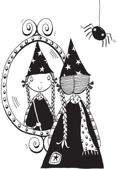At home, Jessica hurried into the kitchen and rummaged about under the sink until she found a roll of large black bin liners. She fetched Sellotape and scissors and paints. Half an hour later, she was standing in front of the long mirror in the hall wearing her new witch’s cape and her pointy hat, now painted black with gold stars. She picked up the broom and put one leg either side of it.