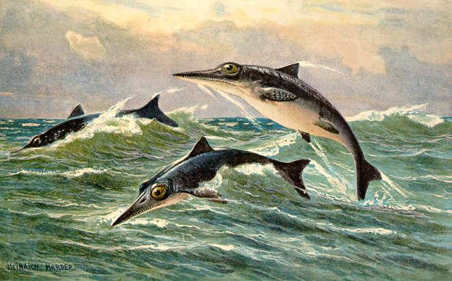 Вдали мелькнули вспугнувшие рыбоящеров длиннорылые морские крокодилы, похожие на индийских гавиалов. Правда, они только спереди походили на своих собратьев – сухопутных крокодилов, а всем остальным мало отличались от рыб. Такие же ласты вместо лап и такой же рыбий хвост. Спину свободно плававших в море крокодилов покрывал костный панцирь. Длина отдельных экземпляров превышала 2,5 метра.