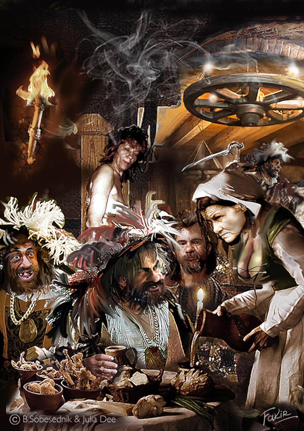 Уютное местечко, в коем по неведомым пока ещё причинам праздно томился упоминаемый в начале нашего повествования господин, являло собой небольшое, сравнительно чистое, насколько позволяют туземные обычаи, помещение посетителей эдак на двадцать пять – тридцать с огромным камином посередине, единственным квадратным маленьким окошком, тщательно забранным мешковиной, и предназначалось, по-видимому, для обслуживания уважаемых людей по особым случаям. Ни дать ни взять банкетный зал! Несколько коптящих под потолком толстенных свечей давали в достатке мутного дрожащего света, кроме того, – о невиданная роскошь! – подсвечник стоял на каждом столе. Не-е-ет, черни явно не место здесь! Иной расклад там, за стеной! М-м-м-м! Громкая ругань, хохот, глухие удары, крики, женский визг, чёрт-те какие еще музыкальнейшие звуки варящегося, бурлящего, рвано-вонючего необычайно живого перфоманса, проникая урывками сквозь худую перегородку, вызывали неудержимое желание поучаствовать, напиться до соплей, помацать огромные упругие грязные сиськи, вполне возможно, схлопотать по физиономии, вываляться в грязи и, сломав, наконец, к всеобщему удовольствию пару-тройку челюстей и носов, провести остаток ночи за решёткой в тёплой компании потерявшего всякий облик человеческий разномастного отребья. Впрочем, гость наш никакого интереса до всеобщего веселья не проявлял либо весьма деликатно заинтересованность эту свою скрывал.