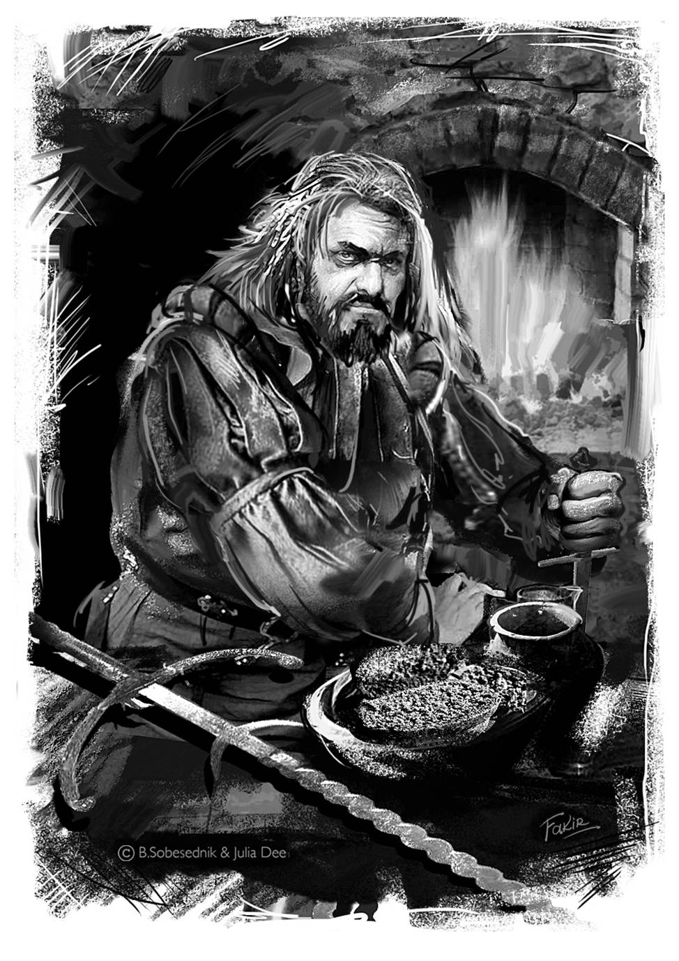 Почти полностью сокрытое косматой неухоженной бородищей, лицо под ней просматривалось волевое и решительное. Крупный, преломленный чуть ниже переносицы нос, нависая над тяжёлым, далеко выдающимся подбородком, придавал незнакомцу сходство с огромной хищною птицей. Схожесть вдобавок усиливали глубоко посаженные серо-стального цвета глаза, при всей своей напускной осоловелости чутко реагировавшие на каждый звук, каждое дуновение сквознячка, любое мимолетное движение. У такого орла, в народе молвят, мышь за спиной не проскочит незамеченной! В то же время, кажущееся нарочито медлительным и неповоротливым, это грузное человечье нагромождение излучало некую затаённую энергию, силу недюжинную звериную, готовую в любой момент разжаться, развернуться пружиною стальной и молниеносно ударить насмерть! Справедливость подобных предположений совершенно недвусмысленно подтверждал и немереной длины обнажённый двуручный меч, возлежащий здесь же, на столе, под правой рукой хозяина.