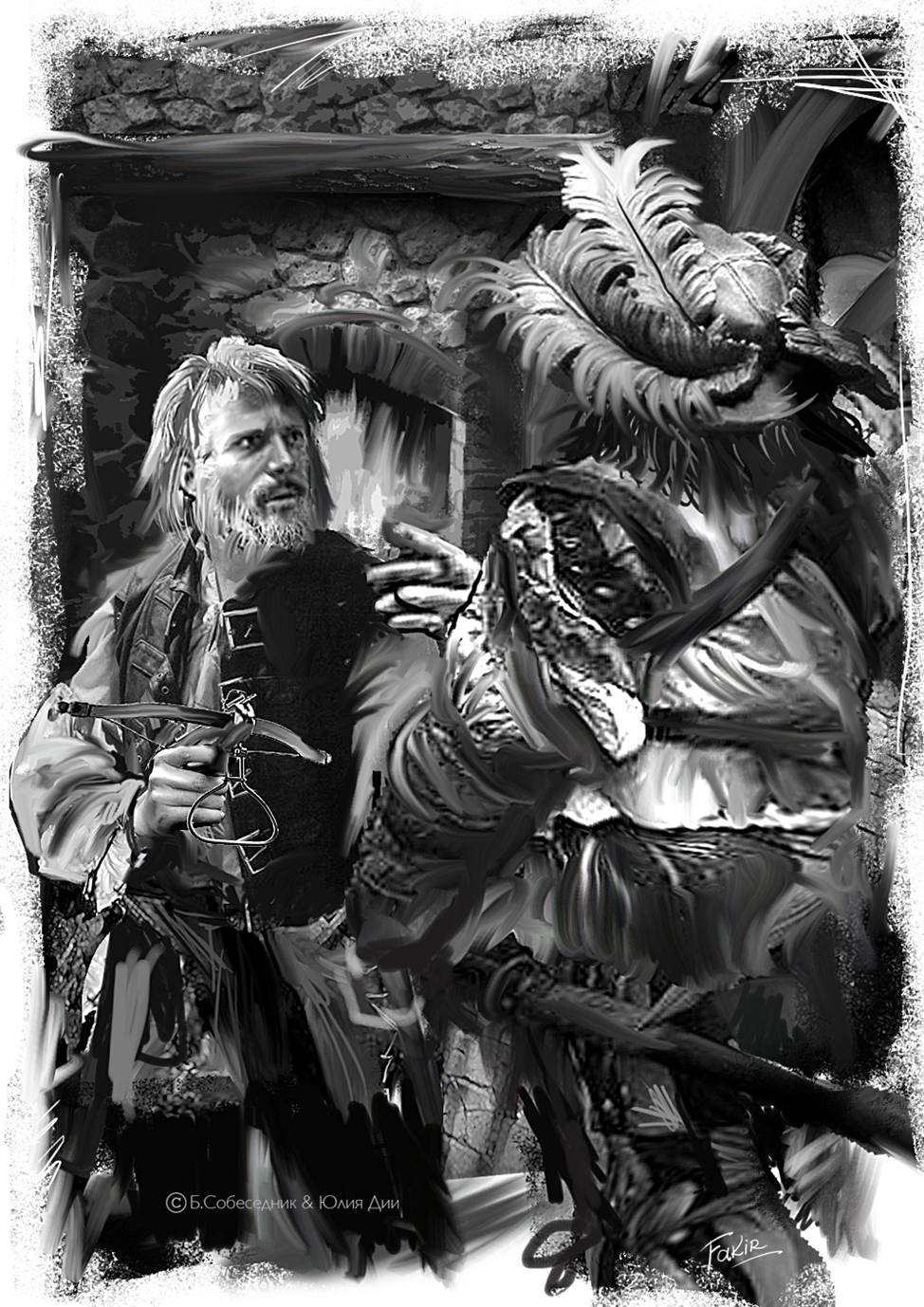 – Не в бровь шуту балаганному, а в самый правый глаз! Не веришь? Сходи посмотри, вандаба! Готов и дальше судьбу испытывать, глупец? – в спокойном голосе Роланда послышались стальные угрожающие нотки. – Будь по-твоему. Но сначала всё же послушай. Видишь тёмный налет на кончике стрелы? Это яд онорской пустынной рогатки. Слыхал о таковой? Весьма сильнодействующая отрава, можешь мне поверить. Изготовлена самим Араахом, милостью Ваагла лучшим алхимиком Несферы. Посему, куда бы я тебе ни попал, солдат, а попаду я всенепременно, будь уверен, сдохнешь ты медленно и крайне мучительно. Достаточно лишь слегка царапнуть. Стрела же эта, выпущенная в упор, как ты и сам прекрасно знаешь, прошьёт насквозь любой доспех, не то что стёганку сраную твою! И будь спокоен, рука моя не дрогнет! А теперь хватит уже дурака валять, сгрузи-ка всё своё железо бесполезное на соседний стол, дабы не искушать меня боле смертоубийством, и подсаживайся, разговор есть.