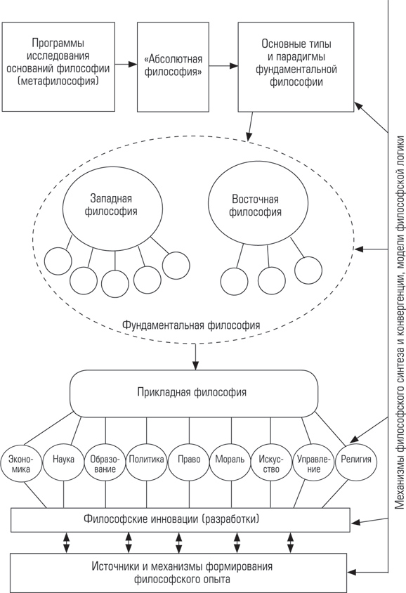 Однако уже в XX в., в особенности в неклассический и постнеклассический период, когда происходит, по выражению В. И. Вернадского, «взрыв научного творчества»[30] и формируется Большая наука, сформировался острый запрос на анализ методологии науки, и когда сама наука становится сложно организованной системой по горизонтали (множество частных наук), вертикали (сложная иерархия уровней точного знания и методов) и опытно-научному инструментарию, субъектной организации научной деятельности. Здесь-то и становится остро необходима специализация и новая осмысленная организация самого философского знания и познания, что выразилось прежде всего в формировании множества частно-философских или прикладных философских областей в виде философии науки, философии культуры, философии менеджмента, философии права, философии математики, философии химии, философии истории и других, порой более дробных областей философского познания, концентрирующих в себе сферу философских разработок на рубеже фундаментальных наук и других отраслей познания и практики. В итоге такого взаимодействия произошло взаимное обогащение философии и науки и формируется по образному выражению А. Койре, «философская субструктура»[31]. Эта тенденция сейчас осознана как на уровне методологии науки, так и в самой философии.