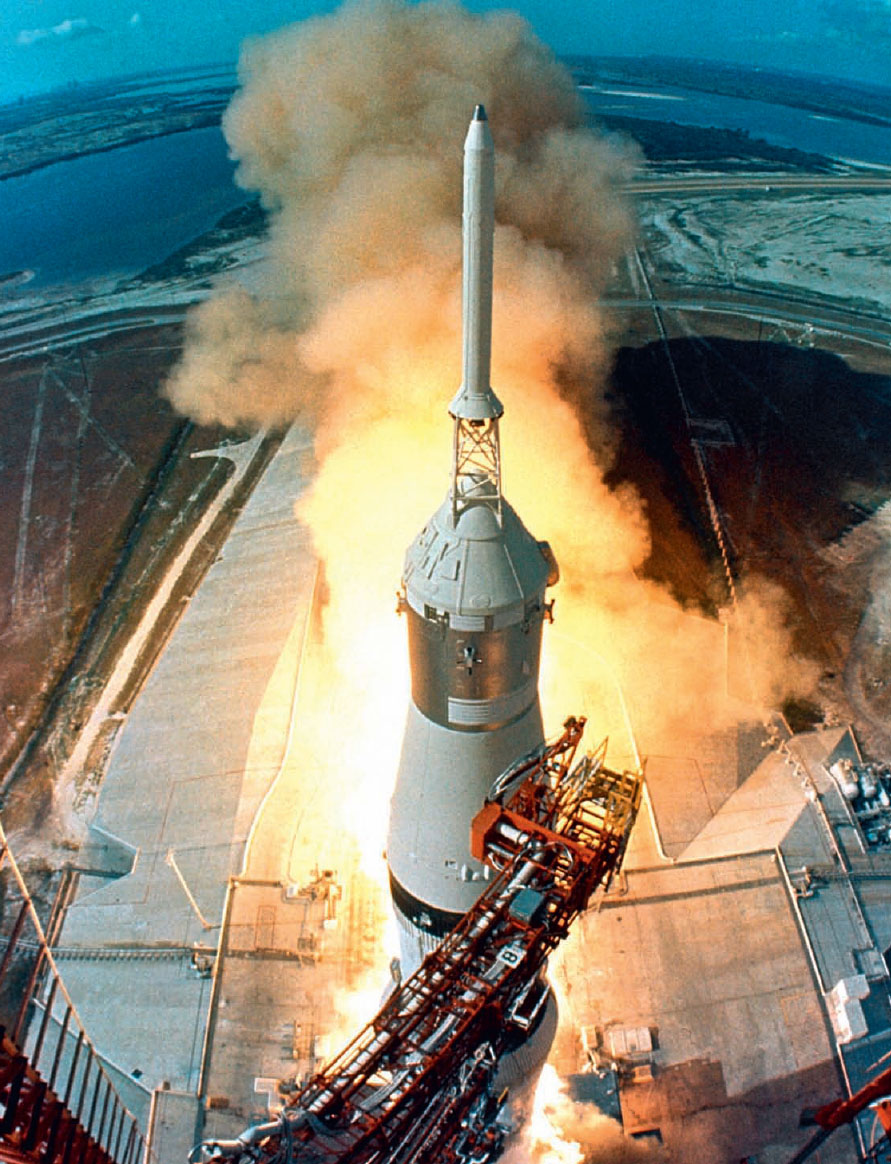 A Saturn V rocket blasts the Apollo 11 mission towards the Moon on July 16, 1969. Astronauts Neil Armstrong, Michael Collins and Edwin Aldrin are in the cone-shaped Command Module in the middle of the picture.