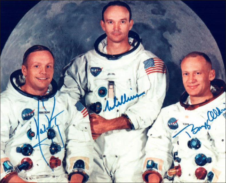 Official photo of Apollo 11 crew (left to right): Neil Armstrong, Commander; Michael Collins, Command Module Pilot; and Edwin ‘Buzz’ Aldrin Jr., Lunar Module Pilot.