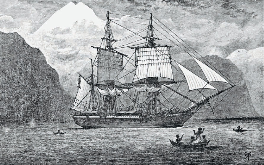 HMS Beagle in the Strait of Magellan, from an 1890 edition of Darwin’s Journals. Monte Sarmiento, ‘the most sublime spectacle in Tierra del Fuego’ according to Darwin, looms over the scene.