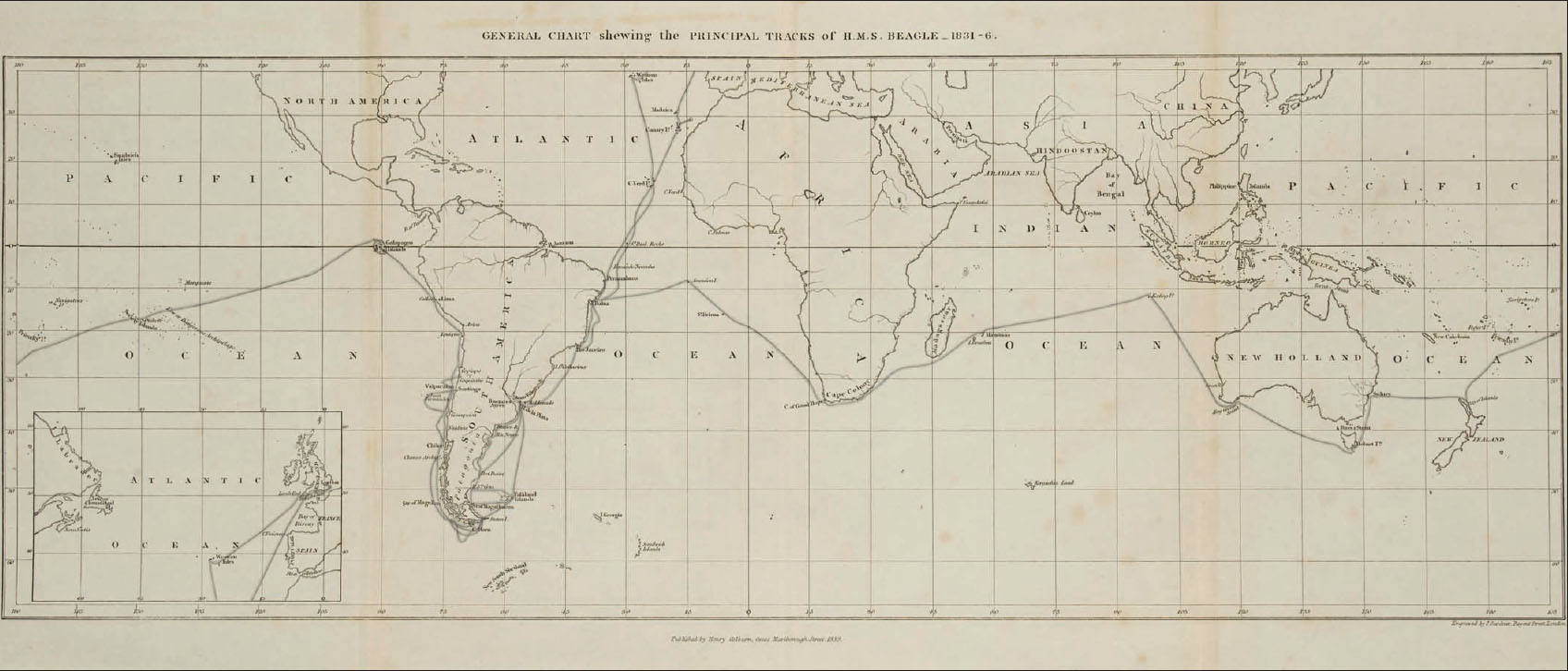 The route of the Beagle, as recorded by Captain Fitzroy in his account of the voyage, published in 1839.