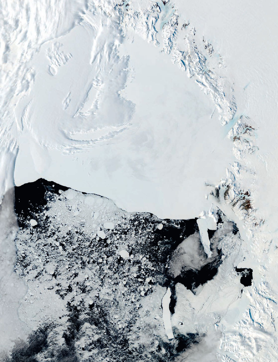 A recent satellite image from a similar vantage point. The Ross Ice Shelf, Transantarctic Mountains (top half) and Ross Sea (lower half) are clearly visible.