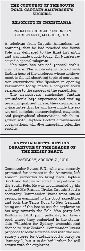 Amundsen’s team arrived back in base camp six weeks after reaching the Pole, on 25 January 1912. They were in Australia at the start of March. News of their success was telegraphed to the world.