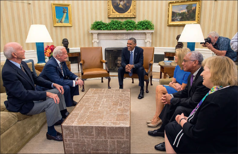 President Barack Obama welcomes Apollo 11 astronauts Michael Collins and Buzz Aldrin (left side) and Neil Armstrong’s widow, Carol (seated third from the right), to the Oval Office on 22 July 2014. Also seated are NASA Administrator Charles Bolden and Patricia Falcone, Director for National Security and International Affairs.