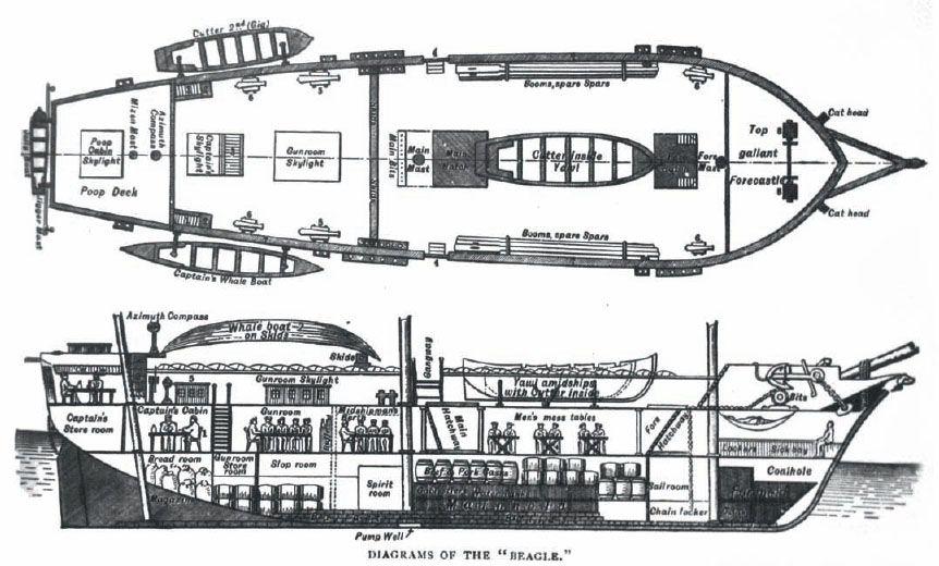 HMS Beagle, as equipped for the voyage. Darwin shared the poop cabin (top left in the cross-section) with two others and with the ship’s library of 400 books.