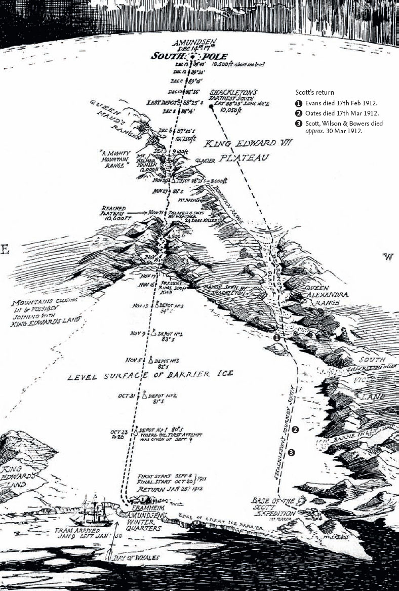 A historical Bird’seye view map of Amundsen’s South Pole Expedition. Scott’s route can also be seen (with added annotations) as it followed the same route as Shackleton’s 1907–09 expedition.