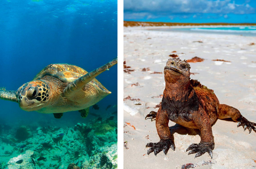 The green sea turtle (left) and the marine iguana (right) were two of the animals on the Galapagos Islands that fascinated Darwin.