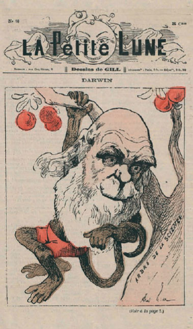 A caricature of Darwin as an ape, on the cover of the French satirical magazine La Petite Lune, published in 1878.