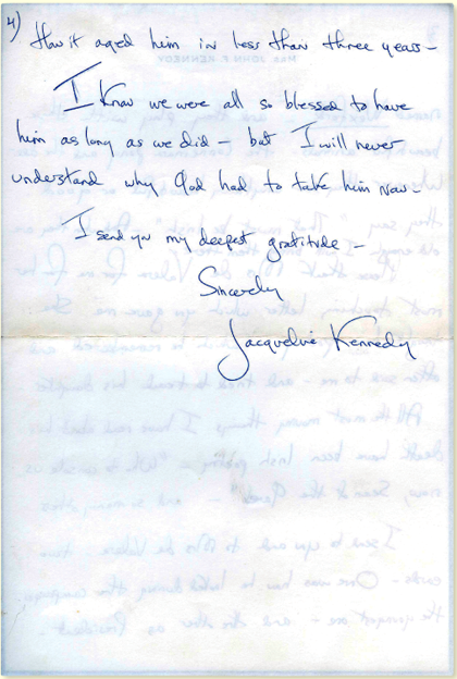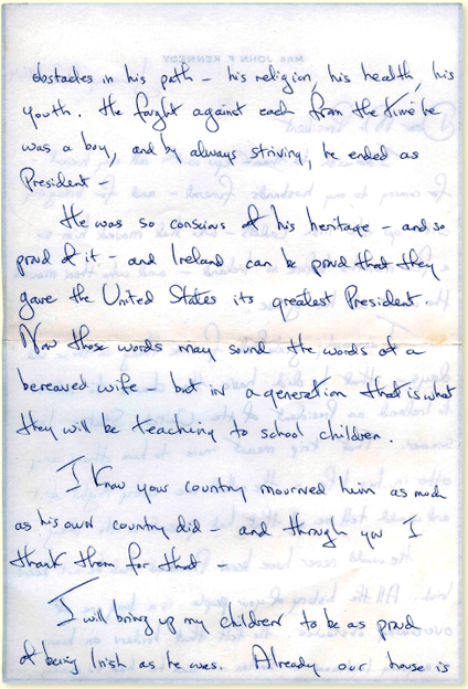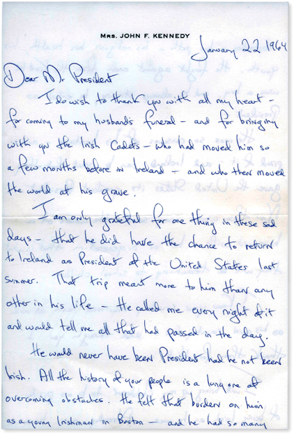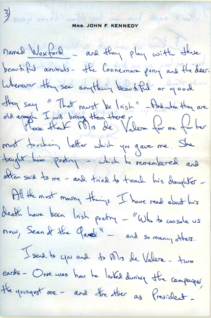 A letter from Jacqueline Kennedy to President de Valera, thanking him for attending her husband’s funeral.