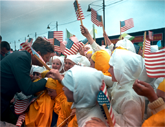 The Irish tricolour comes alive for JFK as children from local schools dressed in orange, white and green rainwear rush to greet him in Galway.