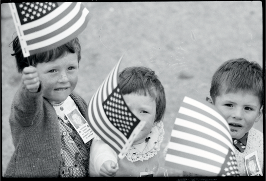 Badge of honour: three small children cheer JFK during his Irish visit.