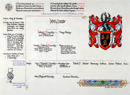 The Kennedy coat of arms and family tree. Down the left side are the names of Kennedy ancestors, beginning with Lorcan, King of Munster. At the top of the chart is an excerpt of a poem by Giolla that dates back to 1420.