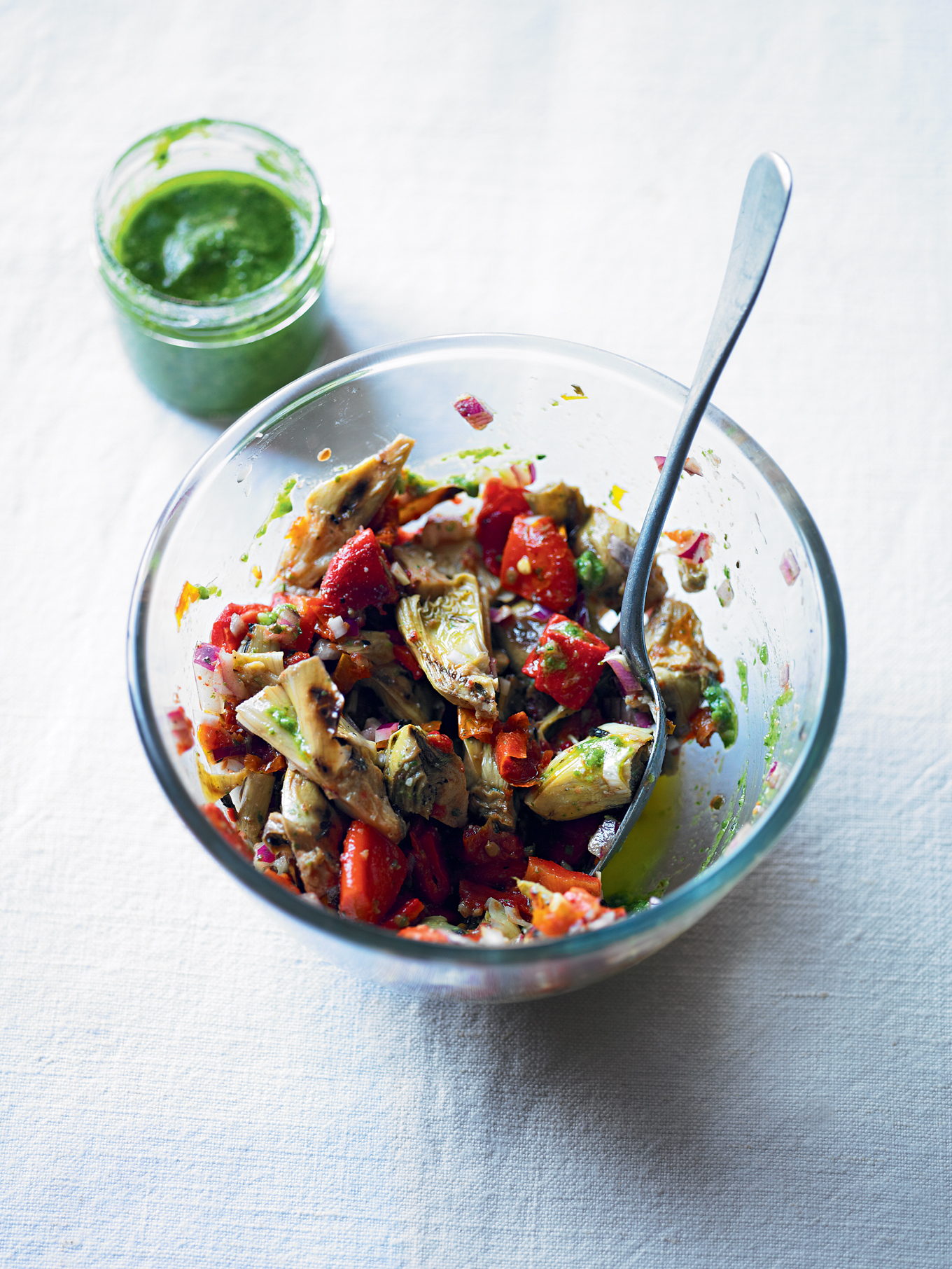 Artichoke hearts in a tin or jar are one of the more luxurious preserved foods. Combined with semi-sun-dried tomatoes and preserved roasted red peppers, this is a really wonderful dish.