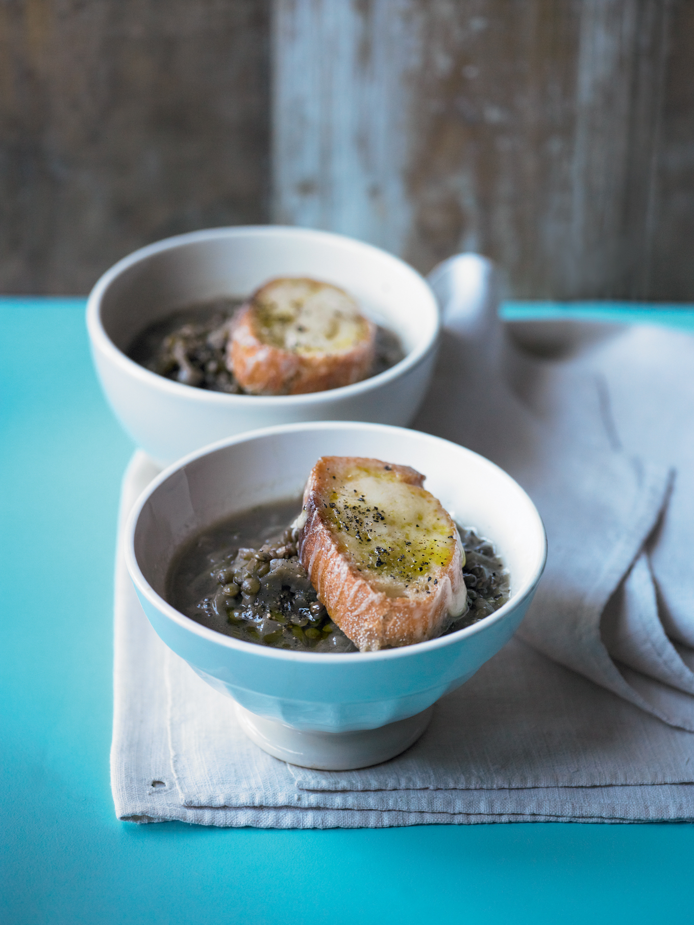 * Season the finished soup with salt and pepper to taste and divide between bowls to serve. Place a whole crouton on top of each bowl of soup and add a grinding of black pepper. (If the slices of bread are too large, you may want to cut them into squares before serving.)