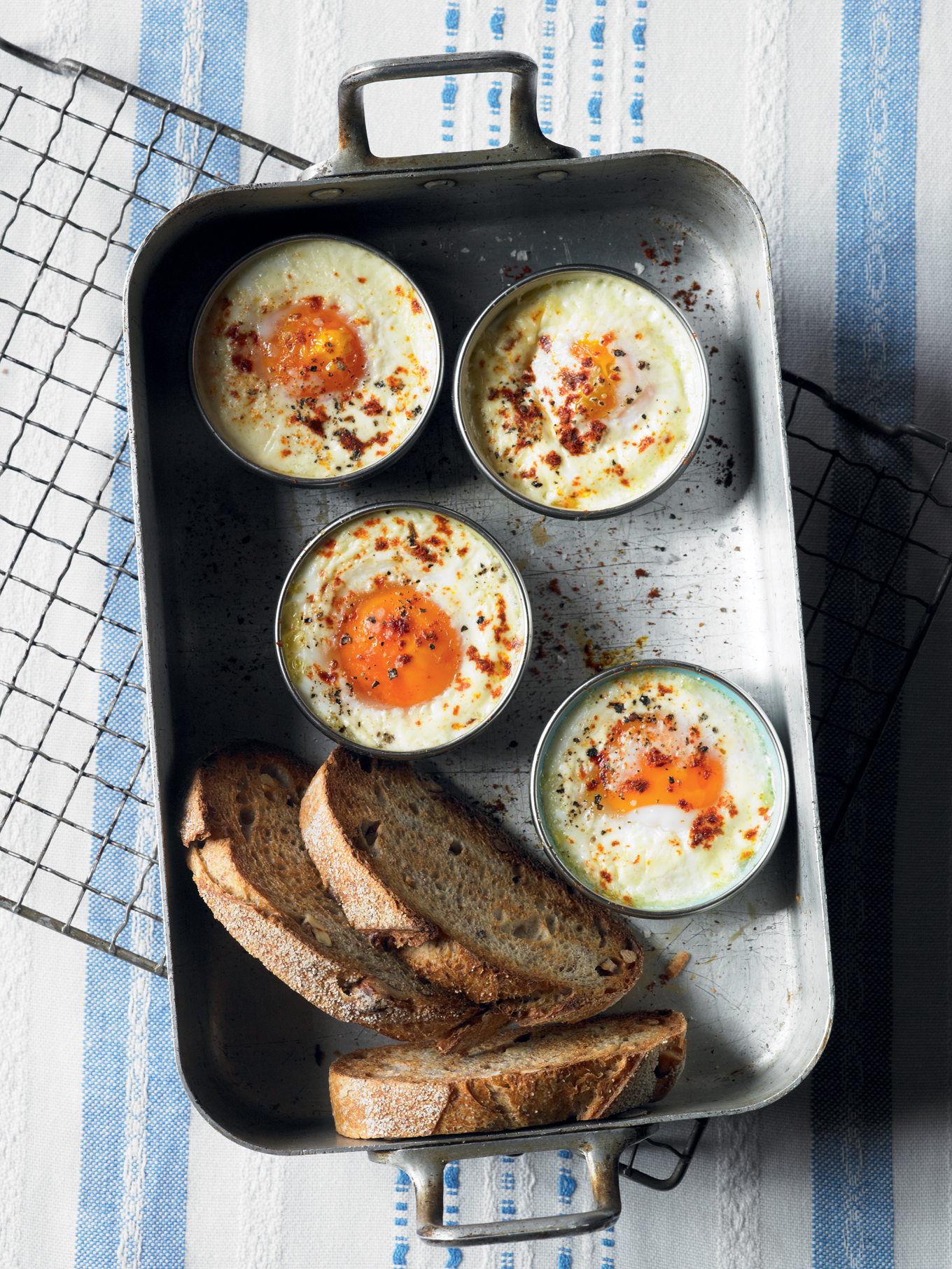 Baked eggs with smoked mackerel: Divide 1 fillet of flaked smoked mackerel between the ramekins before adding the eggs, then proceed as above but omitting the spices.