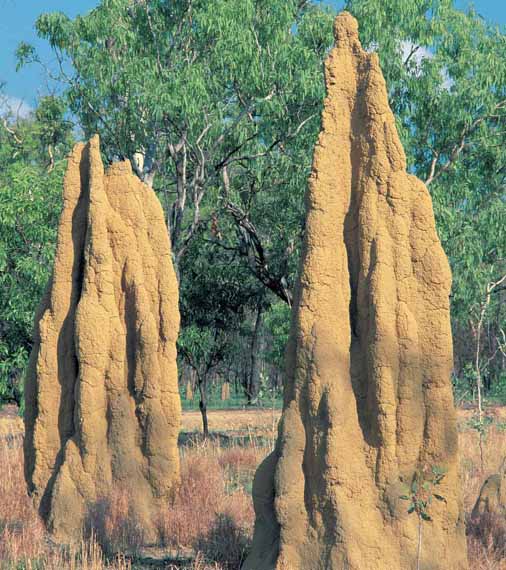 Some 200 species of ant – most famously leafcutter ants – farm fungus inside their nests as a source of fast food. So do about 3,500 beetles and 330 species of termite. But of all these insects, none seems to cultivate a more difficult crop than the African termite, and no crop requires more elaborate technology to maintain it. The staple fungus of African termites grows only on their faeces and needs a very particular temperature. Anything above or below 30.1°C (86°F) is too hot or too cold, and every aspect of the construction of the termite mound is part of an effort to keep the temperature exactly that.