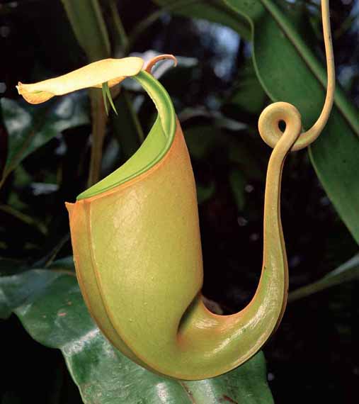 There are many different species of pitcher plant, but all are insect-traps with the slipperiest of sides, providing extra nitrogen (from insect corpses) to help the plants flower and set seed. Among the most sophisticated are the leaves of vine-like Nepenthes. Each of these pitfall traps has an ‘umbrella’ lid and a base partly filled with a soup of digestive enzymes. The lure may be colour (usually red), smell (nectar or, later, rotting corpses) or tasty hairs. When an insect lands on the rim, it slips into the deadly broth, possibly intoxicated by narcotic nectar.