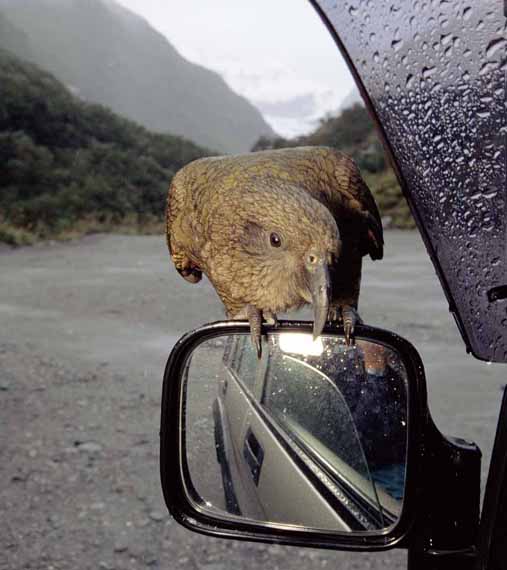 Nowadays great sources of fascination are camping grounds and ski-resorts. These parrots are large and have powerful beaks, and they can rip right through a canvas tent for the sheer joy of investigation. A particular favourite is the rubber on cars – windscreen wipers mainly. One gang of keas is said to have ripped out the rubber lining around the windscreen of a tourists’ hire car, causing the glass to fall inwards and opening up the interior. When the tourists returned, they found clothes, food and car parts scattered in the snow, while the keas appeared to be playing a game of football with an empty Coke can. The birds then retreated and watched – with great curiosity, it seemed – to see what the tourists would do about it.