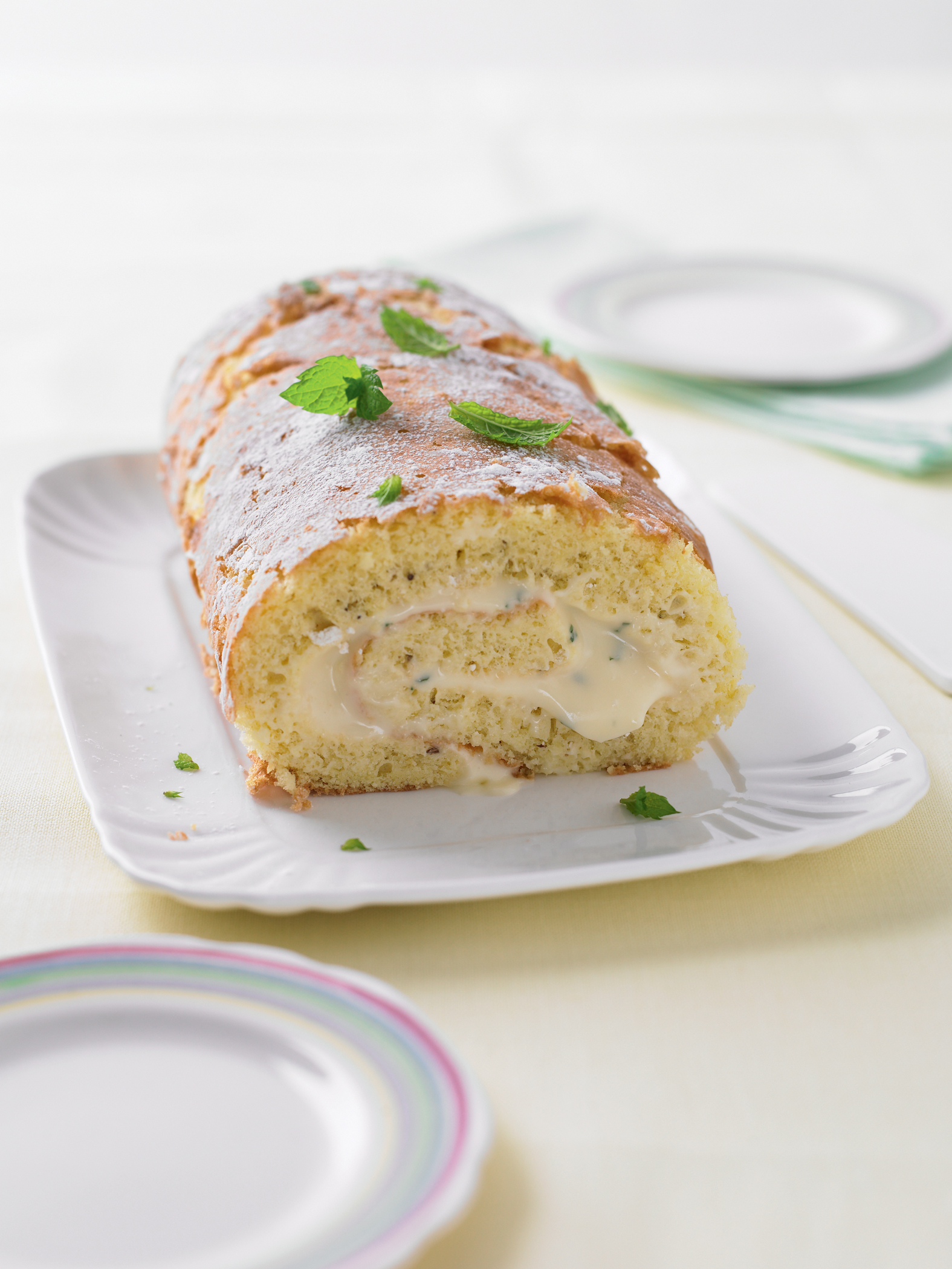 9 Only when the sponge has completely cooled, carefully unroll and spread the inside of the sponge with the lemon and mint cream. Now, re-roll the cake using the baking parchment to help keep it all together. Place on a serving dish, dust with a little icing sugar and top with the mint sprig.
