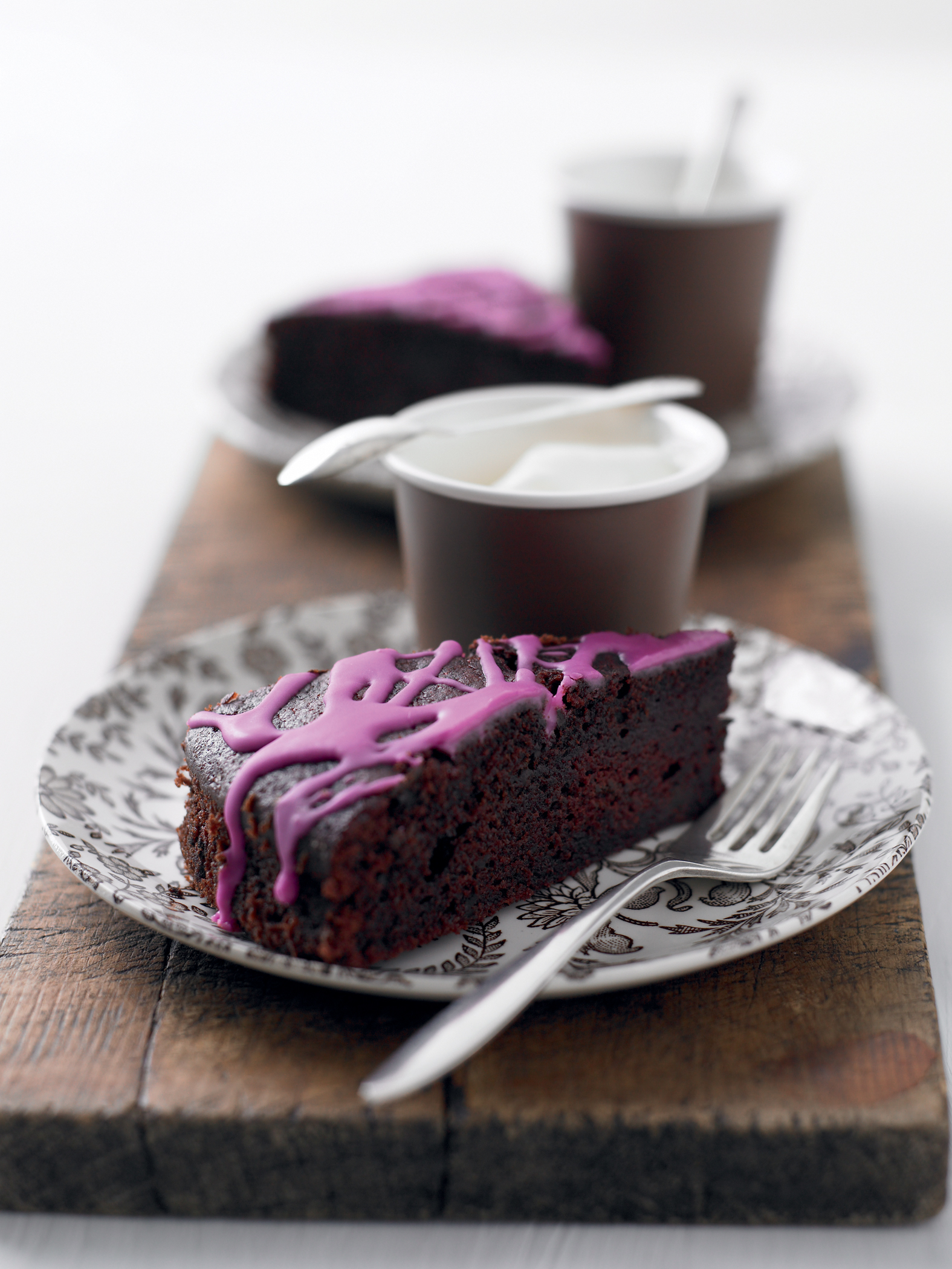 7 To make the icing, simply mix the icing sugar with a little of the reserved beetroot juice to make a deep purple pourable icing. Drizzle the icing over the cake and serve with a dollop of low-fat crème fraîche.