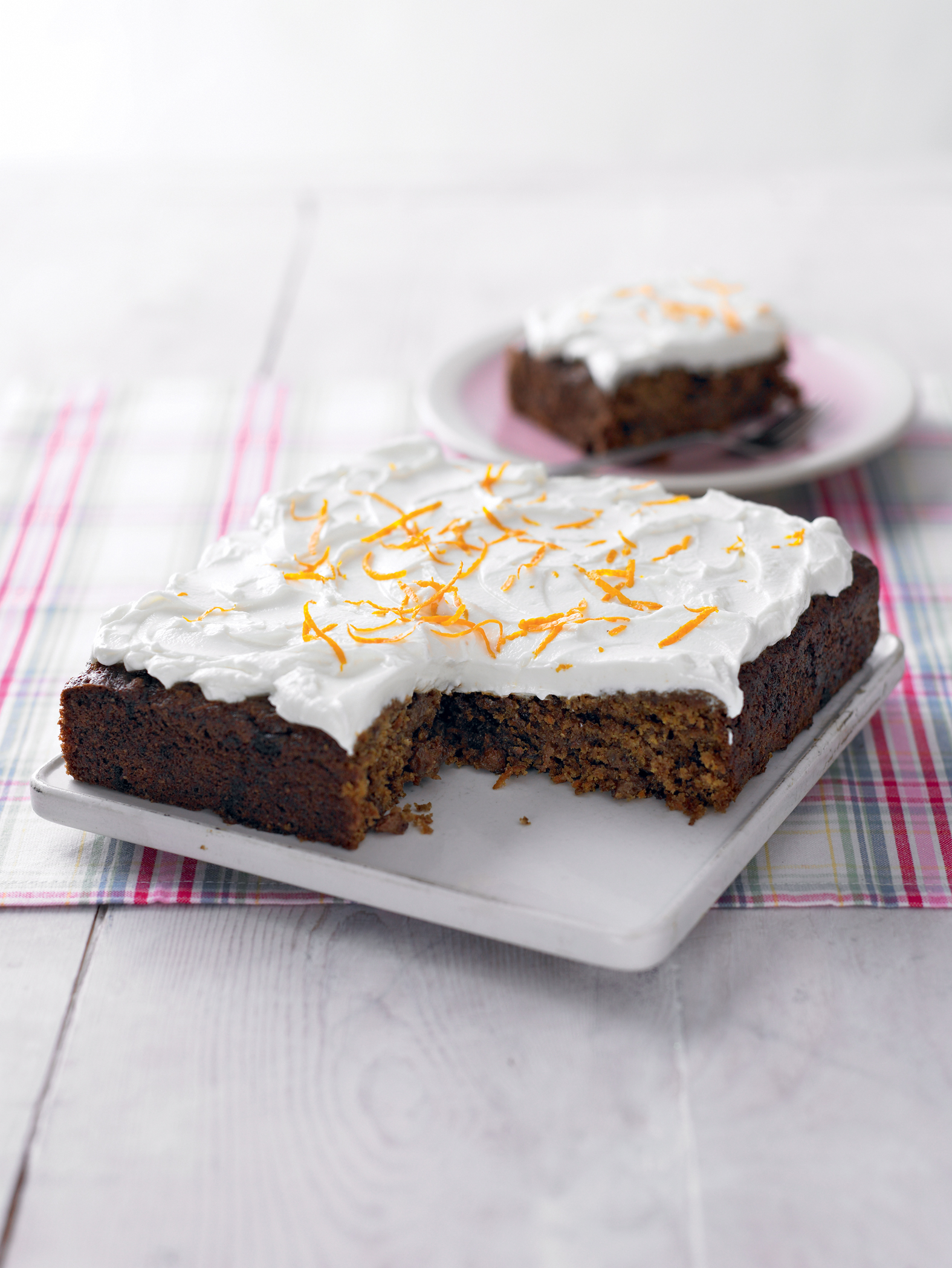 6 To make the frosting, simply mix the Quark, icing sugar and lemon juice together in a bowl. When the cake is completely cold, use a spatula to spread the frosting over the cake and decorate with grated orange zest, then cut into squares and serve.