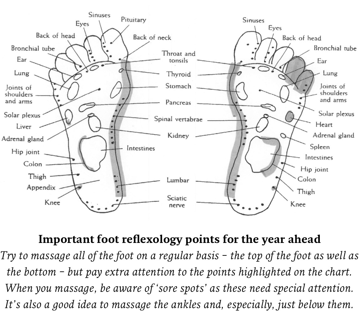 There is a lot that can be done to enhance your health and prevent problems from developing. Give more attention to the following areas (their reflexology points are highlighted in the following chart):