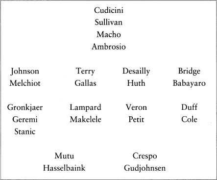 After twenty minutes or so Tottenham went 1 – 0 up – Frederic Kanouté the scorer – and I decided straight away to change things around, playing three at the back with Melchiot alongside Terry and Desailly. I needed to restore the balance tactically. I knew even beforehand that with Hoddle normally playing a back line of three and a playmaker (Jamie Redknapp in this instance) between the defenders and the midfield, we might run into difficulty, but this is precisely the reason I often make changes during the course of a game. First I want to see if my team can adapt to situations as they arise on the pitch, then, if necessary, I make adjustments. It is a way of helping my players to develop, to show their tactical maturity, but obviously, getting the result must come first. Having found the right setup, and with the determination we had, I felt sure we could win the game. And indeed after just a few minutes we equalized, thanks to a nice collective effort rounded off with a header by Lampard from Gronkjaer’s cross. A few seconds later and we were ahead, Mutu scoring from an assist provided by the ever-dependable Duff. This is how a great team responds: forceful, showing character and determination but staying clear-headed. Another moment of significance for the season came in the second half, when I decided to bring on Makelele. He had been on the bench at the start, as I wanted him to get a good look at his new surroundings before taking part. Claude was the last player we had bought, but certainly not the least in terms of importance. He would be the balancing element in midfield. I have always believed that top teams should have a key midfielder playing deep. Besides being quick, Claude had the knack of always being on hand to help out his fellow players, and positioning himself in the right place at the right time. So, could I have picked a better match than the Chelsea-Tottenham derby to introduce him to the atmosphere of the English game?