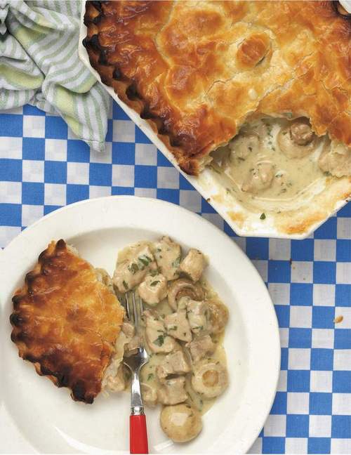 6 For a pastry top, cut the pastry to the same size as the top of the pie dish and arrange over the filling. Make a hole in the centre for steam to escape. Brush with the beaten egg to glaze. Cook in the oven for 10 minutes, then turn down the temperature to 190°C (375°F), Gas mark 5 and cook for about 20 minutes, until the pastry is golden brown.