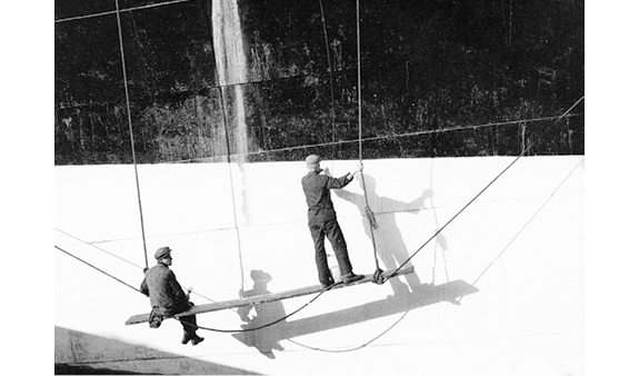At eight o’clock came breakfast, which was a mess of pungent beans and very pickled bacon. I was then told to collect a hammer, a pot of red lead and a brush and go over the side forward to chip the rust off the topsides – a job the more experienced and favoured members of the crew had been engaged in since 6 a.m. Rain was still falling steadily. There were already two or three precarious platforms over the side when I got there. They were simply planks with ropes made fast to either end and belayed on deck.
