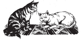 Dogs have to beware of a cat’s pins. Sometimes they use them to prrrrink! at us as we walk by. And then they run off with their tails in the air, and we chase them! Round the house, up the stairs. Into the bedroom, on to the beds.