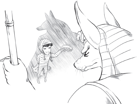 Looming up in front of her was the enormous jackal-headed god of the Underworld himself, Anubis. He was so tall that Isis’s neck hurt to look up at him. He glared down his long snout at her with angry red eyes. There was nothing pet-like about him. Isis gulped.