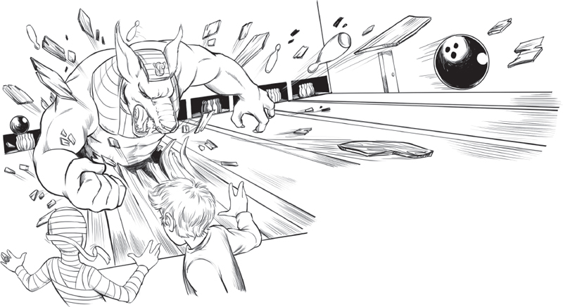 Suddenly, Tom’s voice was drowned out by a loud, rumbling noise. At the end of the lane, the giant, jackal-headed god of the Underworld, Anubis, burst out, splintering the wood and sending the pins flying.