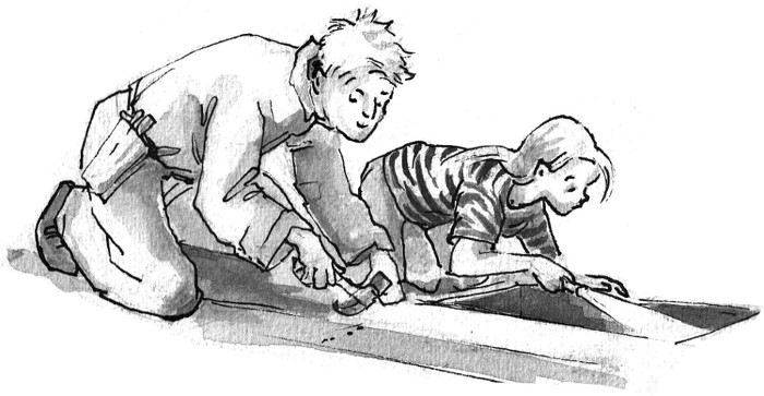 “Hammer, please,” Mr Spark said, and used it to lever out a sharp nail. “Can you hold the torch and shine it under there?”