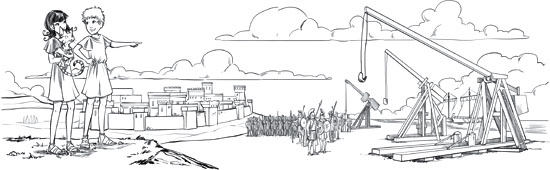 Tom racked his brains for the name. He had seen a diagram of one in his history books. “It’s a trebuchet!” he said, suddenly remembering. “They plonk massive boulders into the hammock thingy on the end of the rope and catapult them against the city walls.”